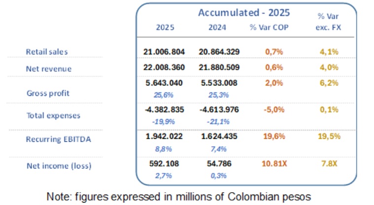 "2025 marked a defining year for Grupo Éxito; After a 2024 marked by a deep transition, last year we focused on stabilizing the operation, strengthening execution and improving key indicators. It was a year of hard work, laying the foundations for a sustainable recovery and that is how we closed the year with solid commercial traction and operational efficiency. In 2025, Grupo Éxito had a healthier and more sustainable profitability and closed with a net result of more than $592 billion pesos, representing a tenfold increase compared to 2024. Consolidated revenues reached $22 trillion pesos, with a growth of 4% (excluding the exchange effect). The Colombian operation was the main driver of the results and contributed 77% of the consolidated figures.