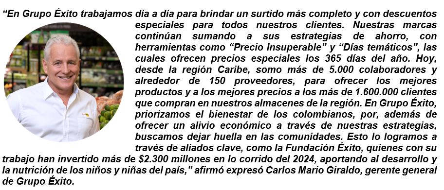 Grupo Éxito con sus marcas Éxito y Carulla fortalece sus estrategias de ahorro en la región Caribe, con ofertas y días de descuentos especiales todos los días del año, las marcas ofrecerán productos a precios competitivos, la mayoría de ellos de la canasta básica familiar, brindando una experiencia única, un descuento real y tangible y un ahorro permanente para las familias de la región, en tiempos económicos desafiantes. Esta es una de las maneras como la compañía aporta su granito de arena al bienestar y a la dignidad de las familias de la zona.