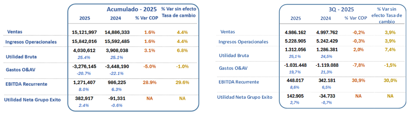 "Grupo Éxito continúa avanzando con firmeza, consolidando trimestre a trimestre los resultados de su estrategia operacional y financiera. Como resultado de esta ejecución disciplinada, se mantienen las tendencias positivas en el crecimiento de los ingresos, la optimización de gastos y costos, y la generación de resultados netos con márgenes en expansión. Durante el tercer trimestre de 2025, los ingresos consolidados crecieron un 3,9% excluyendo efectos de tasa de cambio, impulsados por el sólido desempeño de las operaciones en Colombia y Uruguay. La prioridad estratégica del Grupo sigue siendo crecer de manera sostenible, preservar su solidez financiera, fortalecer el ecosistema de negocios y reinvertir parte de las eficiencias logradas de vuelta al negocio, asegurando la creación de valor a largo plazo para todos sus grupos de interés", afirmó Fernando Carbajal Flores, Vicepresidente Financiero Grupo Éxito.